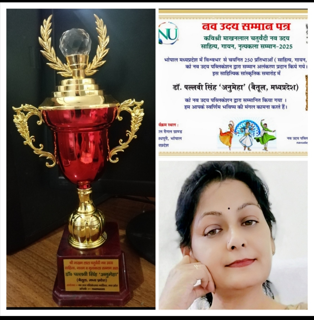 मुलताई/बैतूल-नगर के वरिष्ठ साहित्यकार स्व. नरेन्द्र पाल सिंह पुण्डीर की साहित्यकार पुत्री डॉ. पल्लवी सिंह ‘अनुमेहा’ को नव उदय पब्लिकेशन, ग्वालियर, मध्यप्रदेश द्वारा राष्ट्रकवि ‘श्री माखनलाल चतुर्वेदी नव उदय साहित्य, गायन व नृत्यकला सम्मान-2025’ से सम्मानित किया गया है।