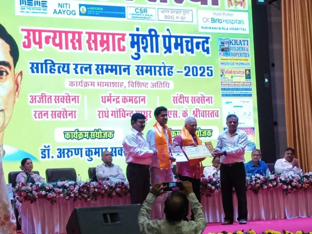 महान साहित्यकार उपन्यास सम्राट मुंशी प्रेमचंद जी की 145 की जयंती पर सियाम ऑडिटोरियम राज्य कृषि एवं प्रबंधन संस्थान दुर्गापुरा, जयपुर में आयोजित भव्य समारोह में शब्दाक्षर के जिला अध्यक्ष कवि रमाकांत सोनी व जिला उपाध्यक्ष तेजसिंह राठौड़ को मुंशी प्रेमचंद साहित्य रत्न पुरस्कार 2025 शाल प्रतीक चिन्ह व सर्टिफिकेट देकर प्रदान किया गया। यह पुरस्कार उन्हें राष्ट्रीय स्तर पर आयोजित प्रतियोगिता में उत्कृष्ट कविता लेखन के लिए प्रदान किया गया।